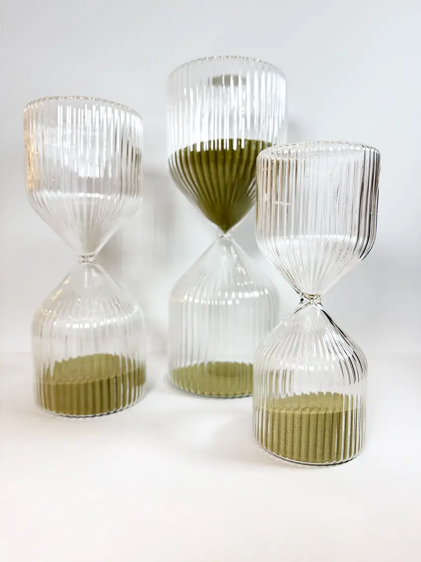 Un sablier en verre transparent avec son sable doré, beauccoup d’élégance pour décorer votre intérieur ou rythmer un moment particulier.