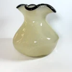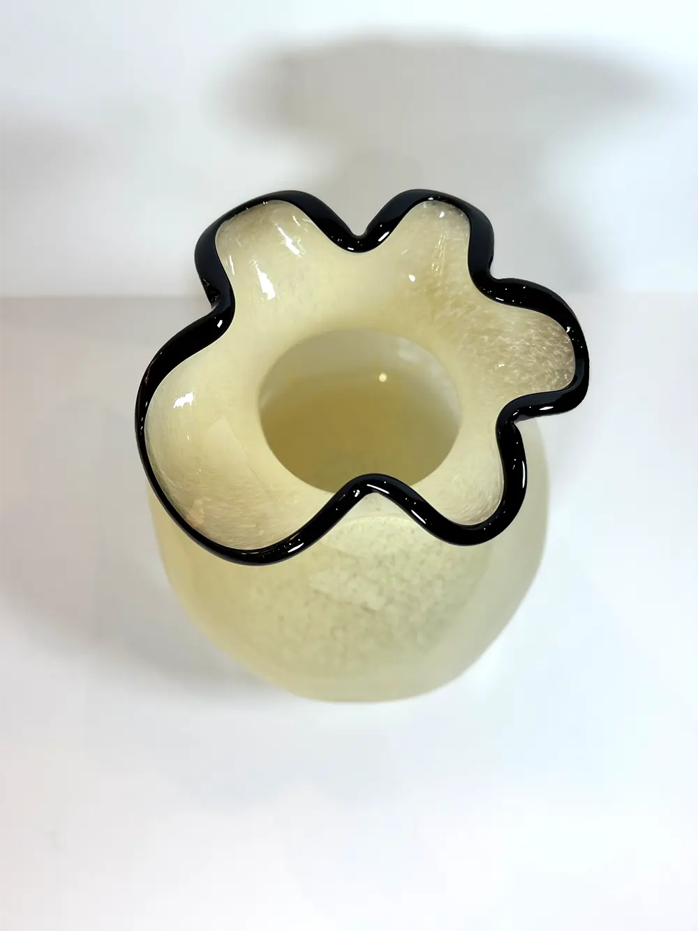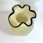 Vase en verre soufflé ivoire avec un aspect légèrement marbré. Le contour de l’ouverture du vase est ondulé et bordé d’un liseré noir brillant, ce qui donne un joli contraste avec la teinte douce du corps.