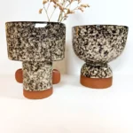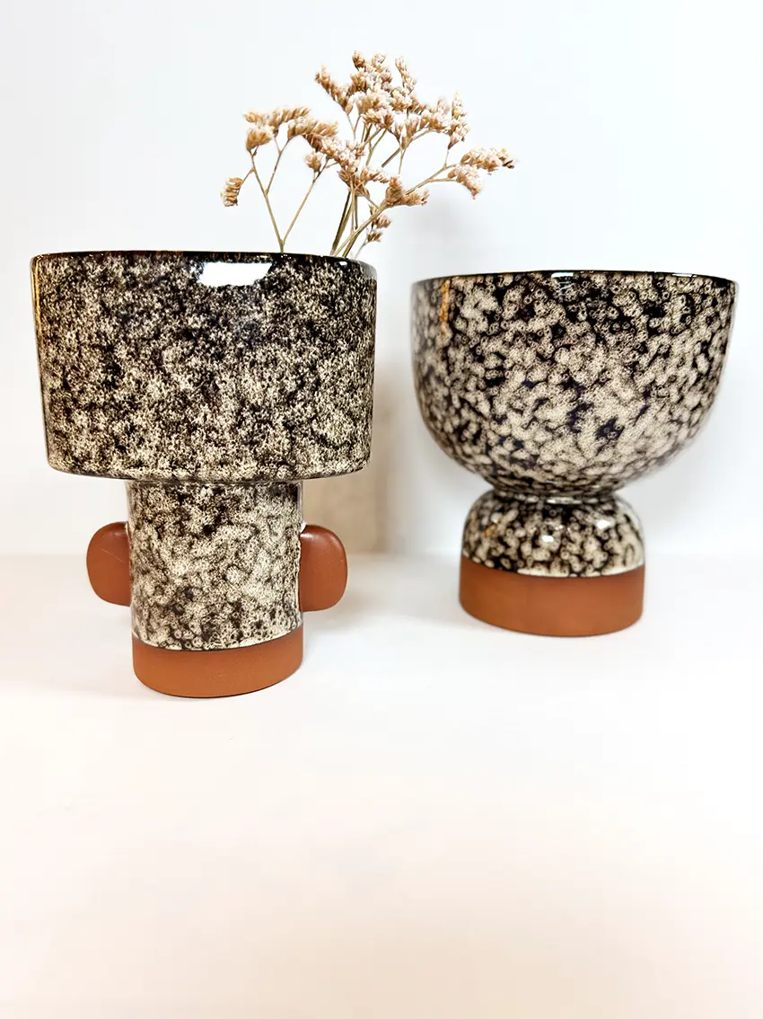 Affirmez votre style avec ce vase en terracotta. Sa forme audacieuse et contemporaine, sublimée par une finition émaillée noire mouchetée contrastant avec la base et les détails bruts en terre cuite, en fait une pièce décorative unique. Parfait pour mettre en valeur des fleurs séchées ou fraîches, il apporte une touche ethnique chic et moderne à votre intérieur, qu’il soit bohème, industriel ou design.