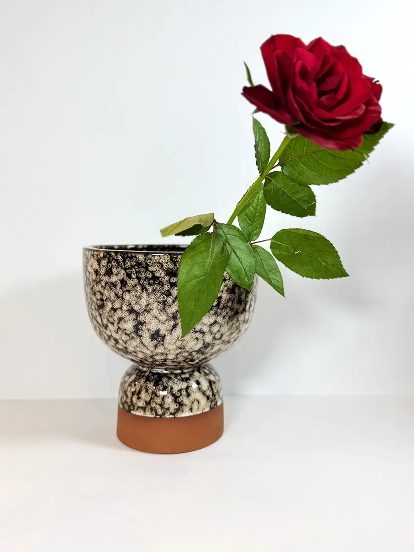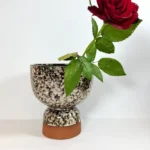Affirmez votre style avec ce vase en terracotta de 18 cm. Sa forme audacieuse et contemporaine, sublimée par une finition émaillée noire mouchetée contrastant avec la base et les détails bruts en terre cuite, en fait une pièce décorative unique. Parfait pour mettre en valeur des fleurs séchées ou fraîches, il apporte une touche ethnique chic et moderne à votre intérieur, qu’il soit bohème, industriel ou design.