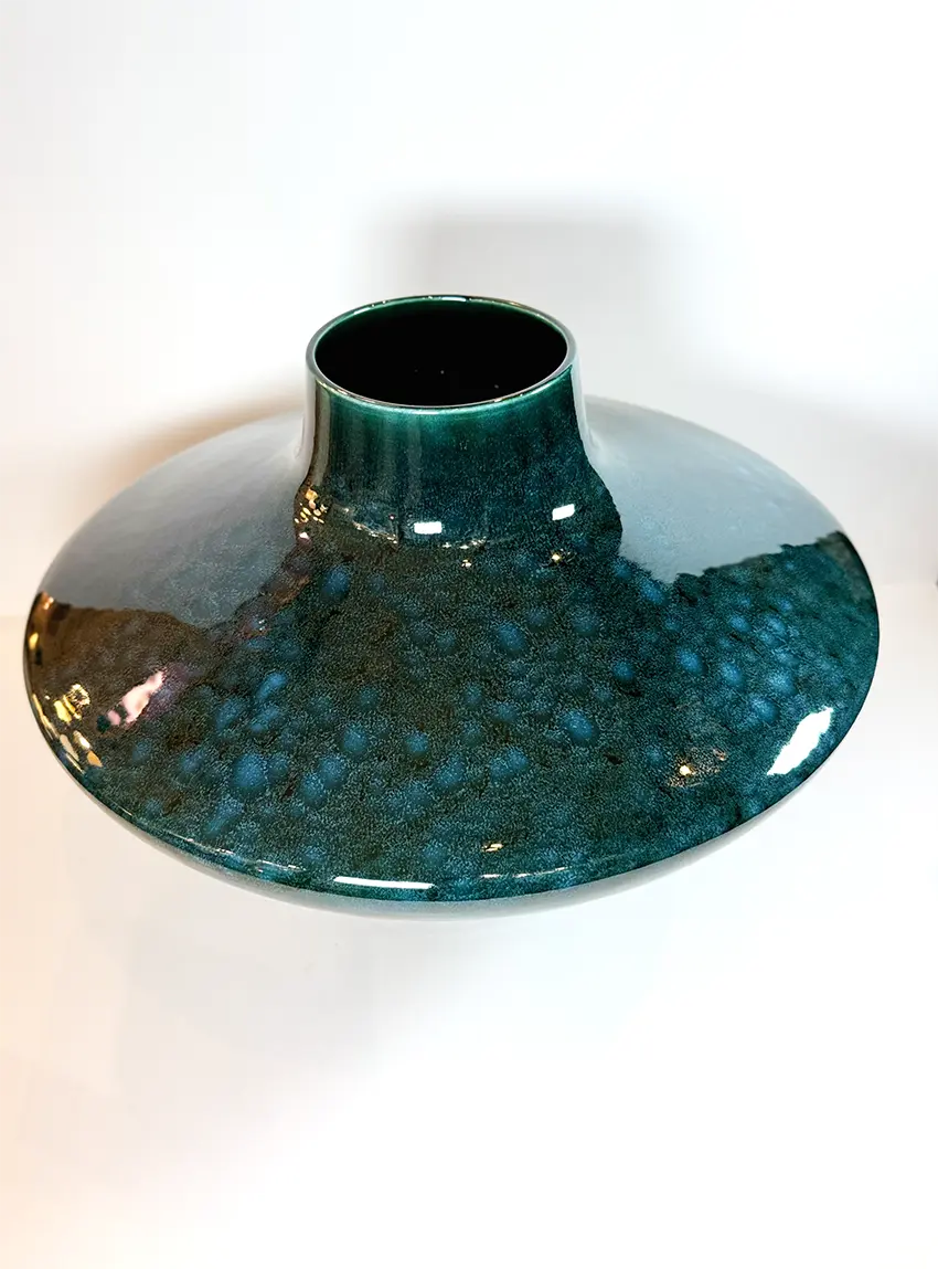 Avec son émail réactif vert profond et sa forme sculpturale, ce vase apporte une touche d’élégance à tout intérieur. Pièce unique, réalisée à la main, il est aussi remarquable orné d’une seule fleur que présenté seul comme objet d’art. Un vase d’exception qui allie avec brio fonctionnalité et style.